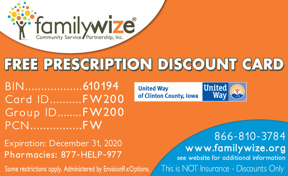 FAMILY WISE PRESCRIPTION DISCOUNT DRUG CARD is available below. The card enables you to receive discounted prices on prescription drugs. It can offer immediate savings on prescription drugs at participating pharmacies for people that have no health insurance, during deductible periods and for prescription medication not covered by health insurance, Medicare and other benefit plans. This is not insurance, nor is it intended to replace insurance.